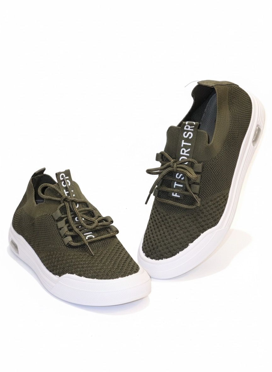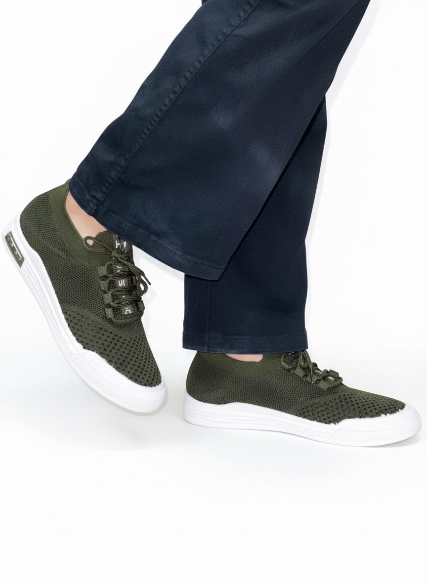 This eye-catching sneaker is constructed with a highly breathable, deep olive green knit mesh upper that provides a flexible, sock-like fit, making it incredibly easy to slip on and off. The rich color of the upper contrasts sharply with the crisp, clean white platform sole, which offers excellent cushioning and stability for all-day wear. The shoe features a subtle, stylish text accent on the collar, reinforcing its active, contemporary vibe. This shoe is a comfortable and stylish choice for casual outings, travel, or light fitness activities.